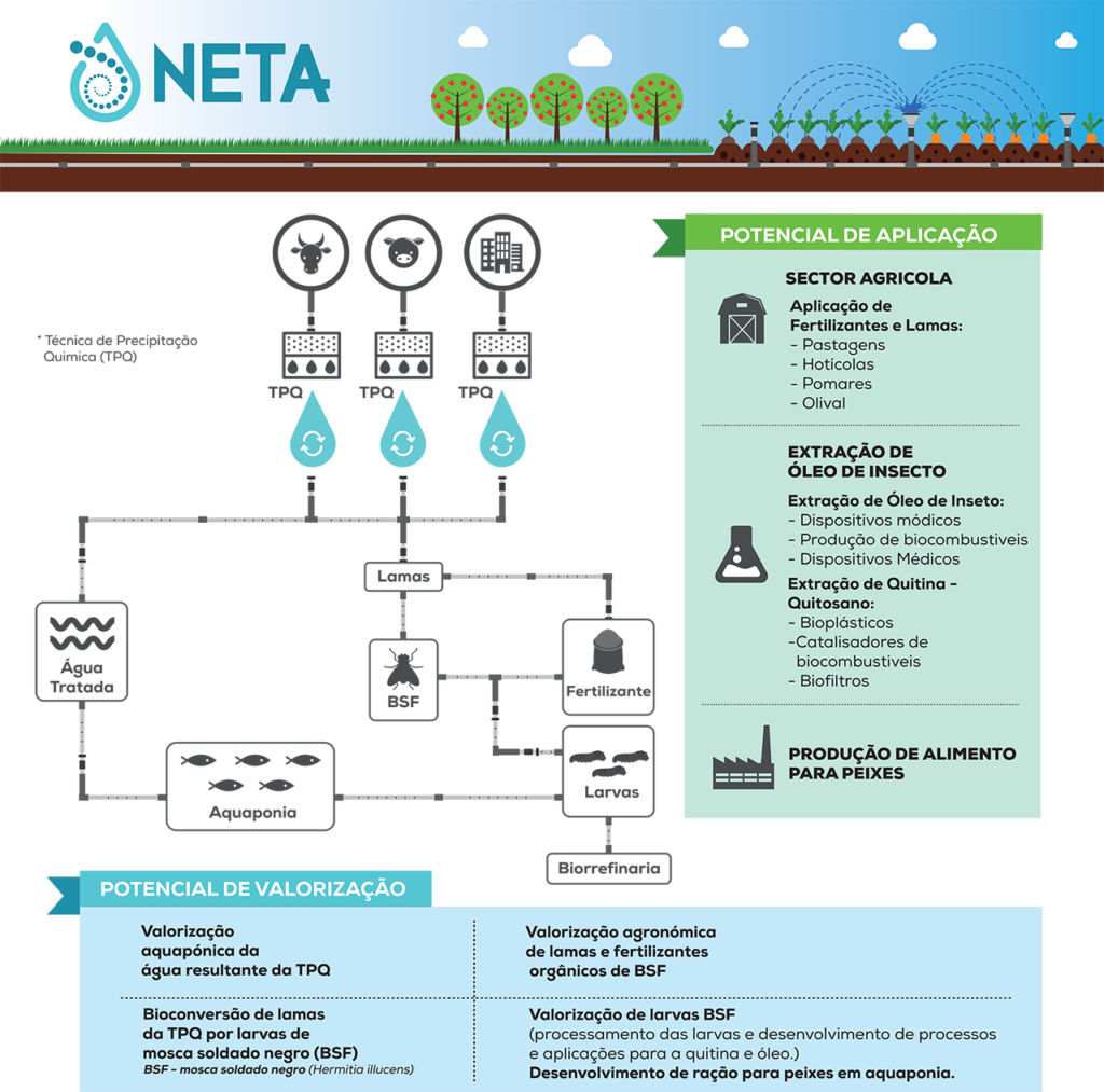 Liderado pela Ingredient Odyssey SA (IO), o projeto NETA pretende optimizar e utilizar a Técnica de Precipitação Química, desenvolvida pelo Instituto Politécnico de Beja (IPBeja), no tratamento de águas residuais, utilizando a água tratada para fins agrícolas, sendo as lamas geradas tratadas por insetos, nomeadamente larvas de mosca soldado negro (Hermetia illucens). A Estação Zootécnica Nacional (Instituto Nacional de Investigação Agrária e Veterinária – INIAV), no Vale de Santarém, será a base dos processos em desenvolvimento, sendo um dos objetivos tornar este centro de I&D num exemplo em circularidade da água.